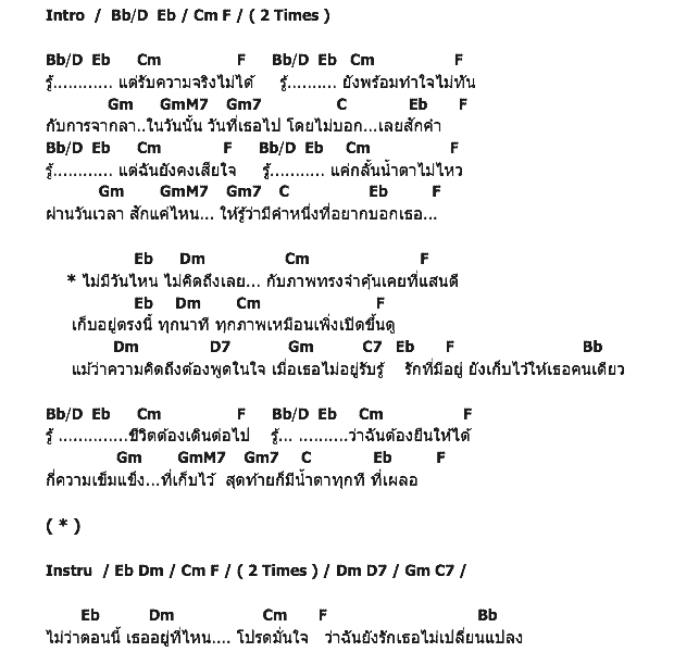 คอร์ดเพลง ไม่มีวันไหน.. ไม่คิดถึงเลย ศิลปิน มัดหมี่ พิมดาว Feat.Win Ratana Chord Mai Mi Wan Nai Mai Khitthueng Loei by Matmi Phim Dao Feat. Win Ratanapol เนื้อร้องเพลง ไม่มีวันไหน.. ไม่คิดถึงเลย ของ มัดหมี่ พิมดาว Feat.Win Ratanapol รู้ แต่รับความจริงไม่ได้ รู้ ยังพร้อมทำใจไม่ทัน กับการจากลา..ในวันนั้น วันที่เธอไป โดยไม่บอก...เลยสักคำ รู้ แต่ฉันยังคงเสียใจ รู้ แค่กลั้นน้ำตาไม่ไหว ผ่านวันเวลา สักแค่ไหน... ให้รู้ว่ามีคำหนึ่งที่อยากบอกเธอ... ไม่มีวันไหนไม่คิดถึงเลย... กับภาพทรงจำคุ้นเคยที่แสนดี เก็บอยู่ตรงนี้ทุกนาที ทุกภาพเหมือนเพิ่งเปิดขึ้นดู แม้ว่าความคิดถึงต้องพูดในใจ เมื่อเธอไม่อยู่รับรู้ รักที่มีอยู่ ยังเก็บไว้ให้เธอคนเดียว รู้ ชีวิตต้องเดินต่อไป รู้... ว่าฉันต้องยืนให้ได้ กี่ความเข็มแข็ง...ที่เก็บไว้ สุดท้ายก็มีน้ำตาทุกทีที่เผลอ แต่ไม่ว่าตอนนี้เธออยู่ที่ไหน.... โปรดมั่นใจว่าฉันยังรักเธอไม่เปลี่ยนแปลงคอร์ดเพลง : ไม่มีวันไหน.. ไม่คิดถึงเลย, ศิลปิน : มัดหมี่ พิมดาว Feat.Win Ratanapol คำร้อง/ทำนอง/เรียบเรียง : ขอบคุณ ผู้สร้างสรรค์ผลงานคำค้นหา : กีต้าร์คอร์ด เนื้อเพลง ไม่มีวันไหน.. ไม่คิดถึงเลย, คอร์ด ไม่มีวันไหน.. ไม่คิดถึงเลย, คอร์ดเพลง, คอร์ดเพลงของ มัดหมี่ พิมดาว Feat.Win Ratanapol, เนื้อเพลงไม่มีวันไหน.. ไม่คิดถึงเลย คอร์ดกีต้าร์, เว็บรวมคอร์ดกีต้าร์